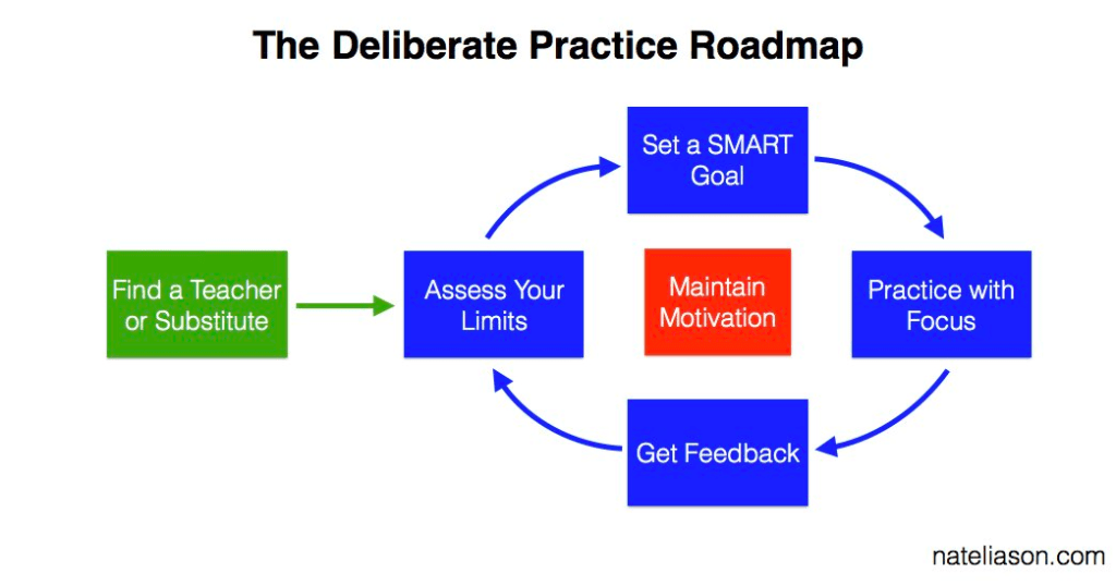 Mientras que la práctica regular implica repeticiones sin sentido y dentro de nuestra zona de confort… la práctica deliberada, ordenada y formalizada involucra atención en los componentes de una habilidad, competencia u conocimiento a través de fijar objetivos específicos y la retroalimentación sobre tu propio desempeño por parte de un experto.