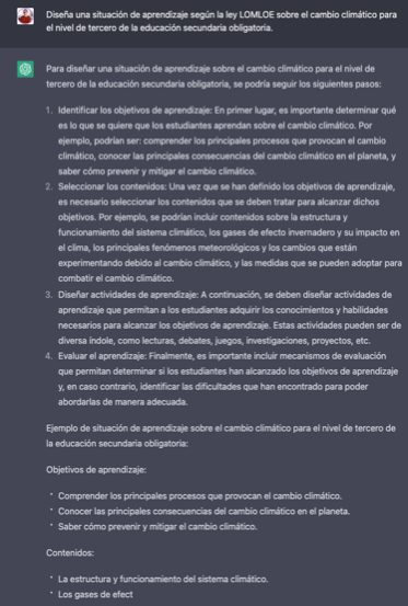 Veamos un ejemplo, a todos nos costó entender qué era o que entendía la nueva Ley de Educación LOMLOE (en España) como «situación de aprendizaje». Así en crudo he recurrido a ChatGPT preguntando lo siguiente: «Diseña una situación de aprendizaje según la ley LOMLOE sobre el cambio climático para el nivel de tercero de la educación secundaria obligatoria».