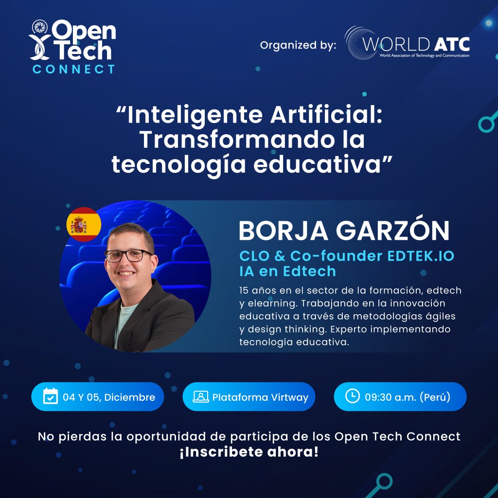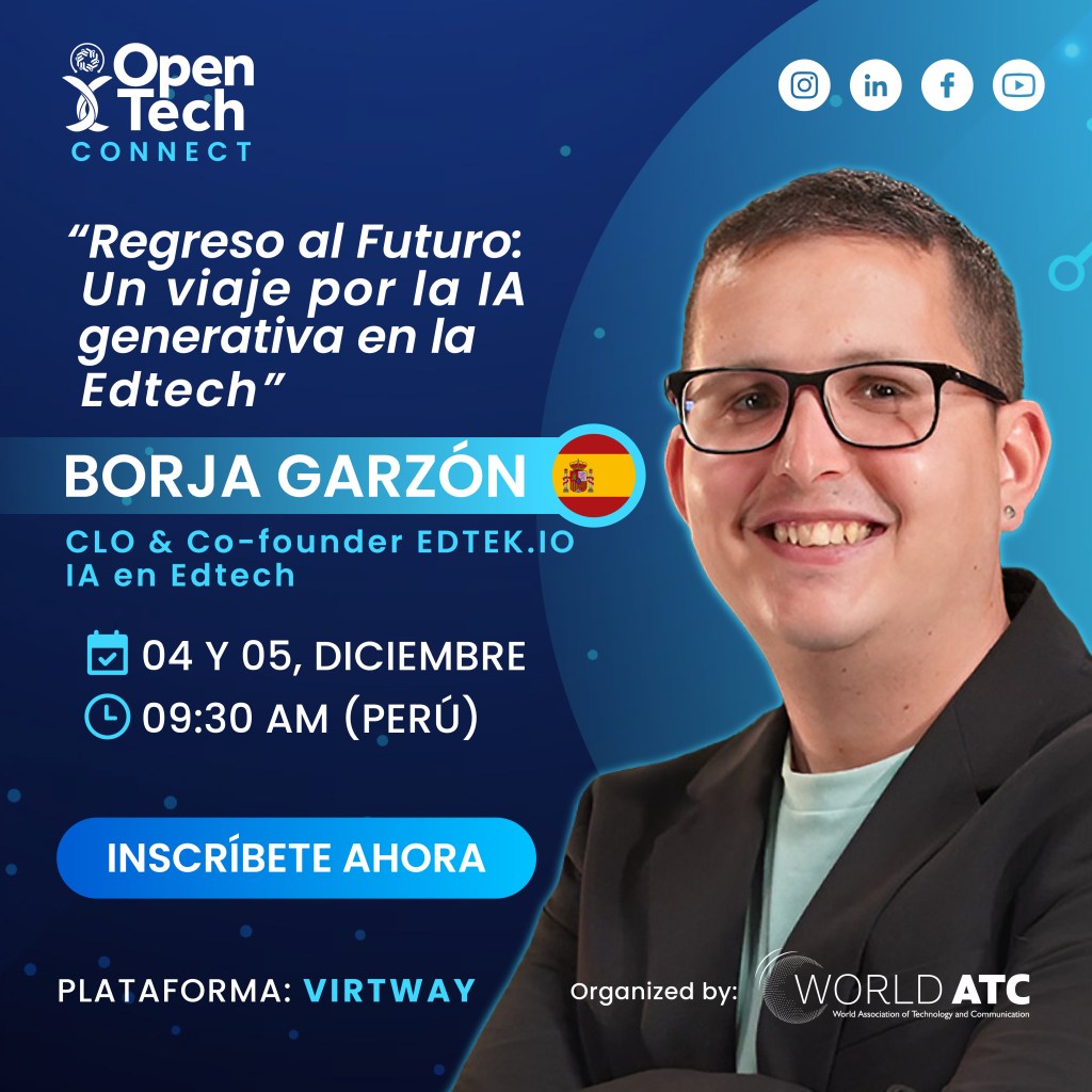 Hoy tengo el placer de invitaros al evento Open Tech Connect, que se celebrará en formato virtual los próximos 4 y 5 de diciembre. Estaré participando como speaker en una conferencia que promete ser un viaje de regreso al futuro, explorando el apasionante impacto de la Inteligencia Artificial generativa en la educación y además, en una segunda ponencia hablaré de transformación digital en la educación.