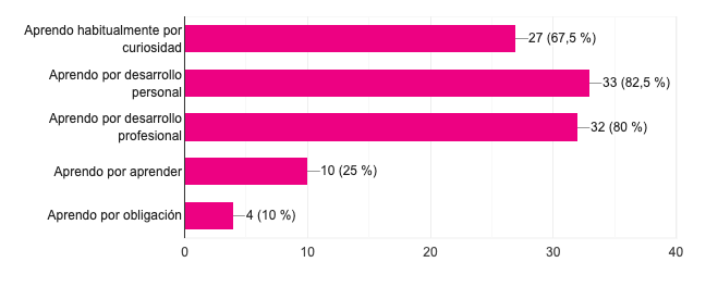En cuanto a cómo aprendemos, el 68% de los encuestados declara preferir aprender trabajando y practicando en el propio puesto de trabajo. Al mismo tiempo casi el mismo % declara ser autodidacta y/o acuden a seminarios/conferencias para mantenerse actualizados. Mientras que aproximadamente la mitad recurren a formación online. Destaca que un bajo % recurre a formación reglada y/o oficial así como a aplicaciones digitales.
