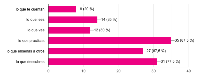 Cuando se les pregunta a qué medios recurren cuando necesitan aprender algo en un 82% de las ocasiones recurren a Google/YouTube y en un 70% preguntan a los compañeros de trabajo o proyecto. En cambio, entorno a un 38% recurren a documentación oficial, manuales técnicos o foros especializados. Y por debajo, en un 20% recurren a la documentación de la empresa, citas, bibliografía… Esto nos lleva a pensar en la necesidad inmediata del consumo de la información y la necesidad de que sea práctica para resolver problemas puntuales sin tener mayor preocupación por un aprendizaje más profundo o significativo. Es necesario un acercamiento entre la dualidad entre esfuerzo en encontrar la información y el formato de la inmediatez con el esfuerzo que requiere el aprendizaje.